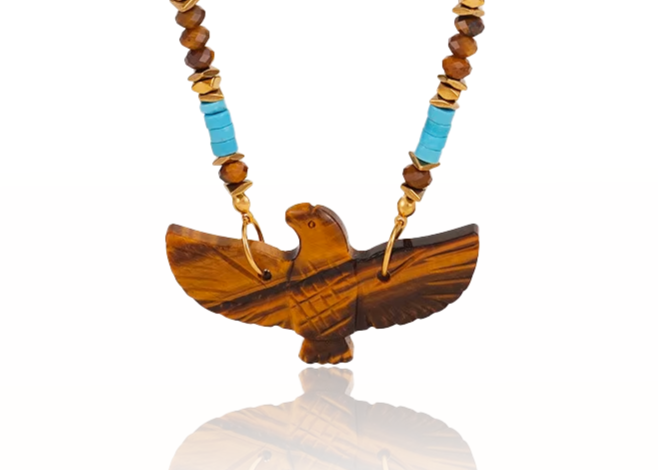 Collier inspiré de la symbolique perse et mésopotamienne de l'aigle, symbole de force et de protection. Les pierres naturelles apportent courage, intuition et harmonie, créant une puissante amulette. L'œil de tigre protège votre aura, tandis que l'aigle vous apporte force et courage.